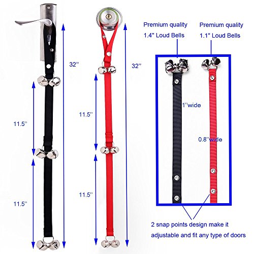★ SET OF 2 DOG BELLS INCLUDE. Our ForeYY dog barking doorbell include 1PC 1″ wide ribbon with 1.4″ loud bells in Red color and 1PC 0.8″ wide ribbon with 1.1″ loud bells in Black color. Both potty training bells have two snap points make it adjustable and easy to hold on any door on the height you select. They may be able to be utilized in different home doors at your preference.